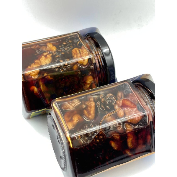 Ядро грецького горіха, цукати та насіння гарбуза, молода соснова шишка в сиропі