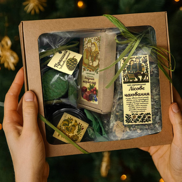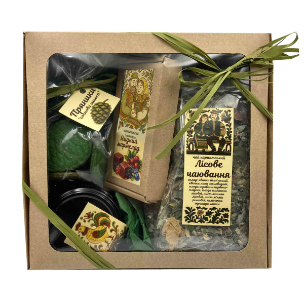 Подарунковий набір “Лісове чаювання” — це ніби маленька подорож у серце Карпат, запакована з любов’ю у крафтову коробку. Відкривши її, ніби чуєш тихий шепіт смерек, аромат вітру з полонини й тепло домашнього затишку.